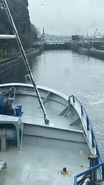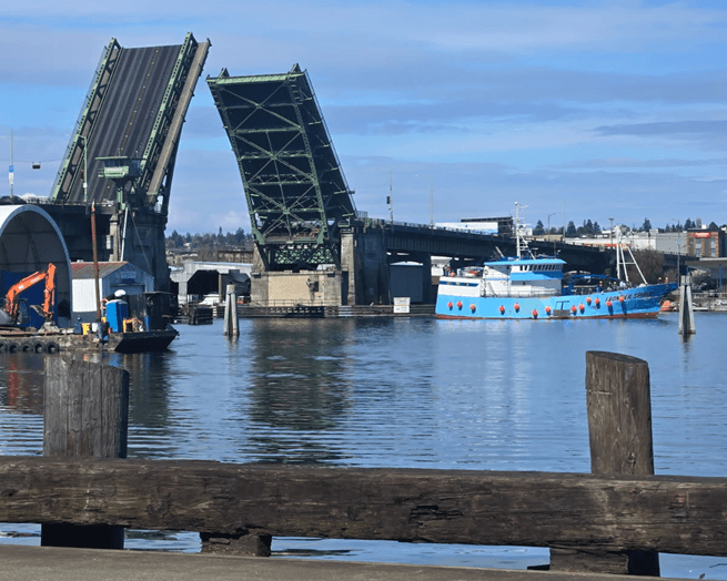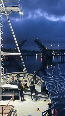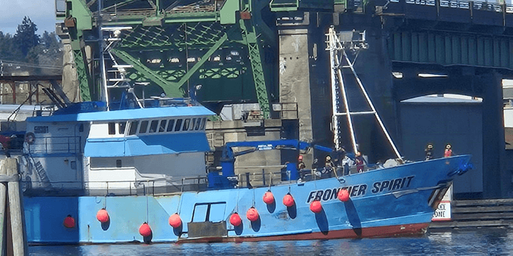 Pictured: F/V Frontier Explorer docked at Coastal Transportation (above), approaching the Hiram Chittenden Locks in Ballard (right), and passing the Ballard Bridge (far right).